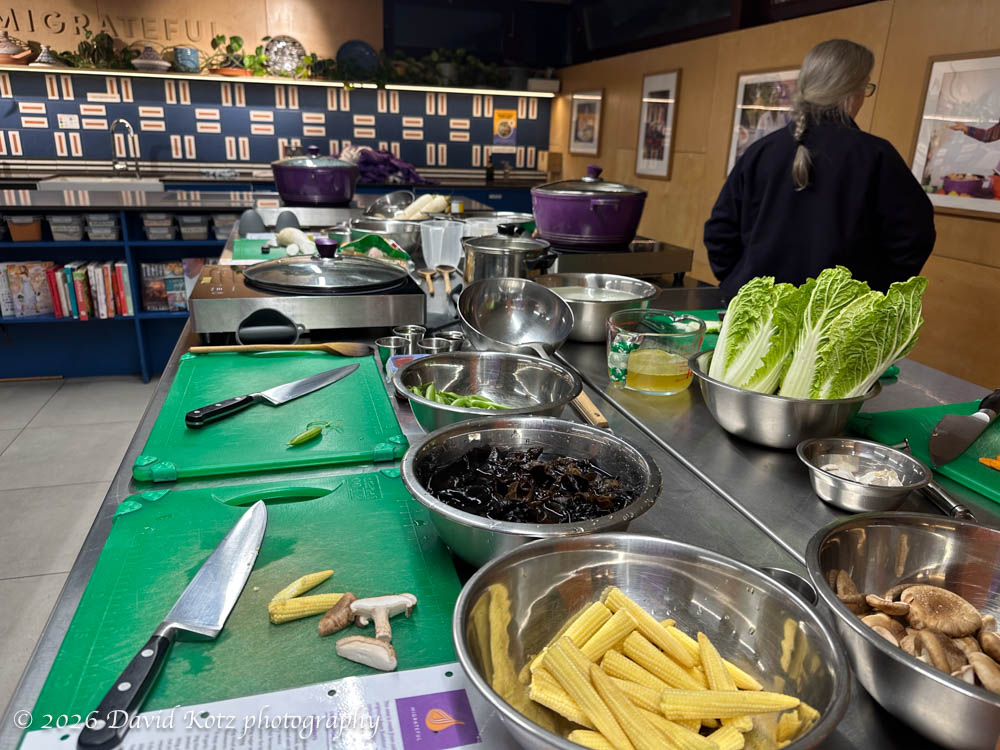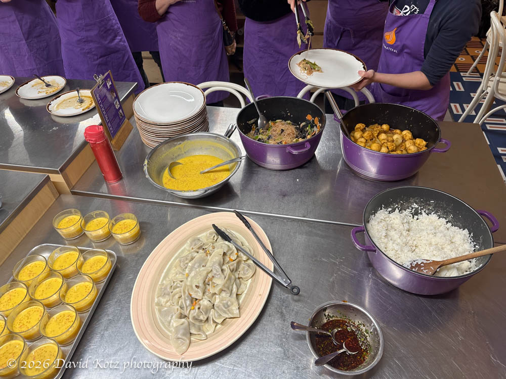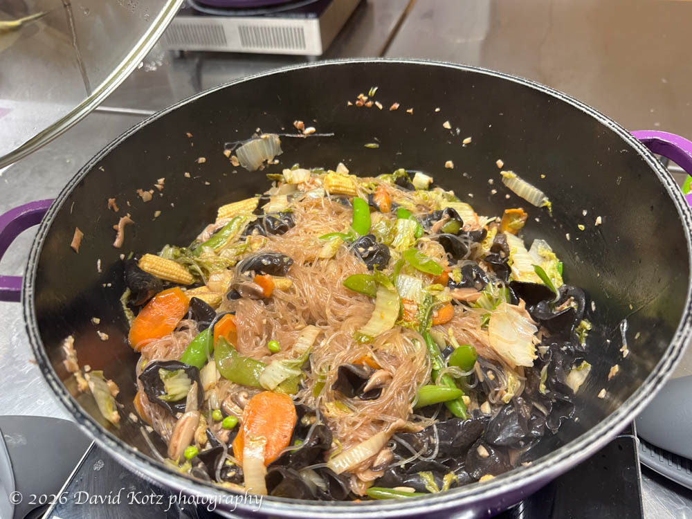 I worked with three other partners to make Lo Han Zhai, a braised vegetable stew “made from colourful vegetables and vermicelli noodles braised in an earthy sauce. It originates from Buddhist cuisine which follows vegetarian principles and the original recipe is said to contain 18 vegetables.” We had a comfortable workspace, and the instructions and ingredients were laid out in advance. Chef Cathy – a migrant from Hong Kong – circulated from station to station to answer questions and advise on proper technique.