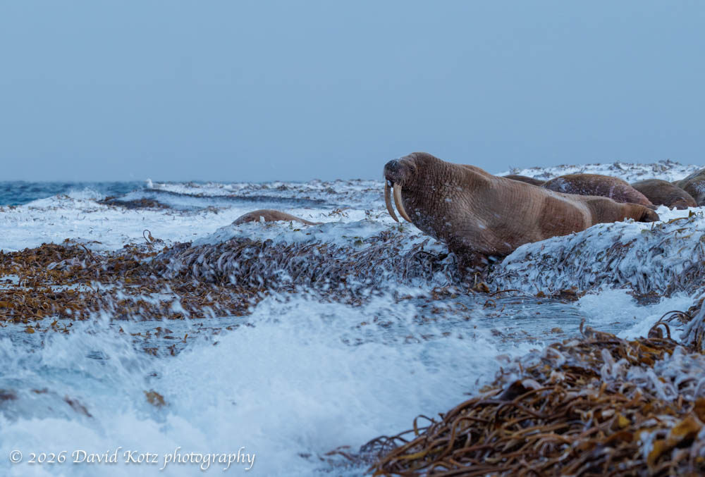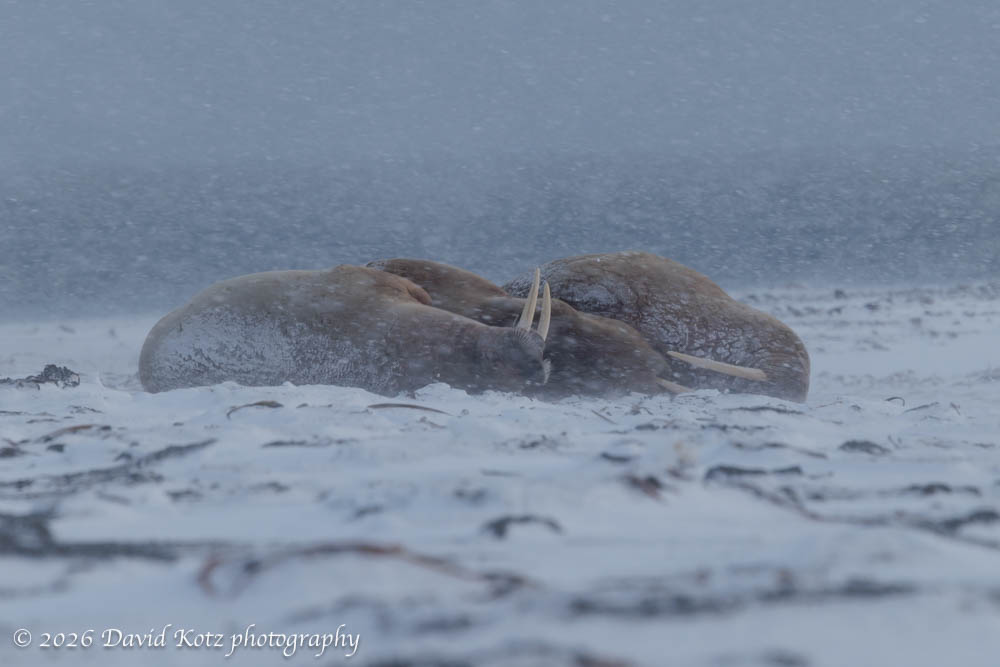 There, on the other side of the island, about two dozen walruses lay napping. We quickly pulled our cameras out of dry bags and snapped photos. The snowstorm made for tricky focusing – I had to focus manually, difficult when wearing heavy mittens! But, with the right exposure, the images give a sense of the conditions in which these walrus live.