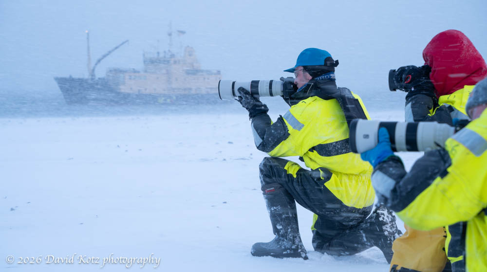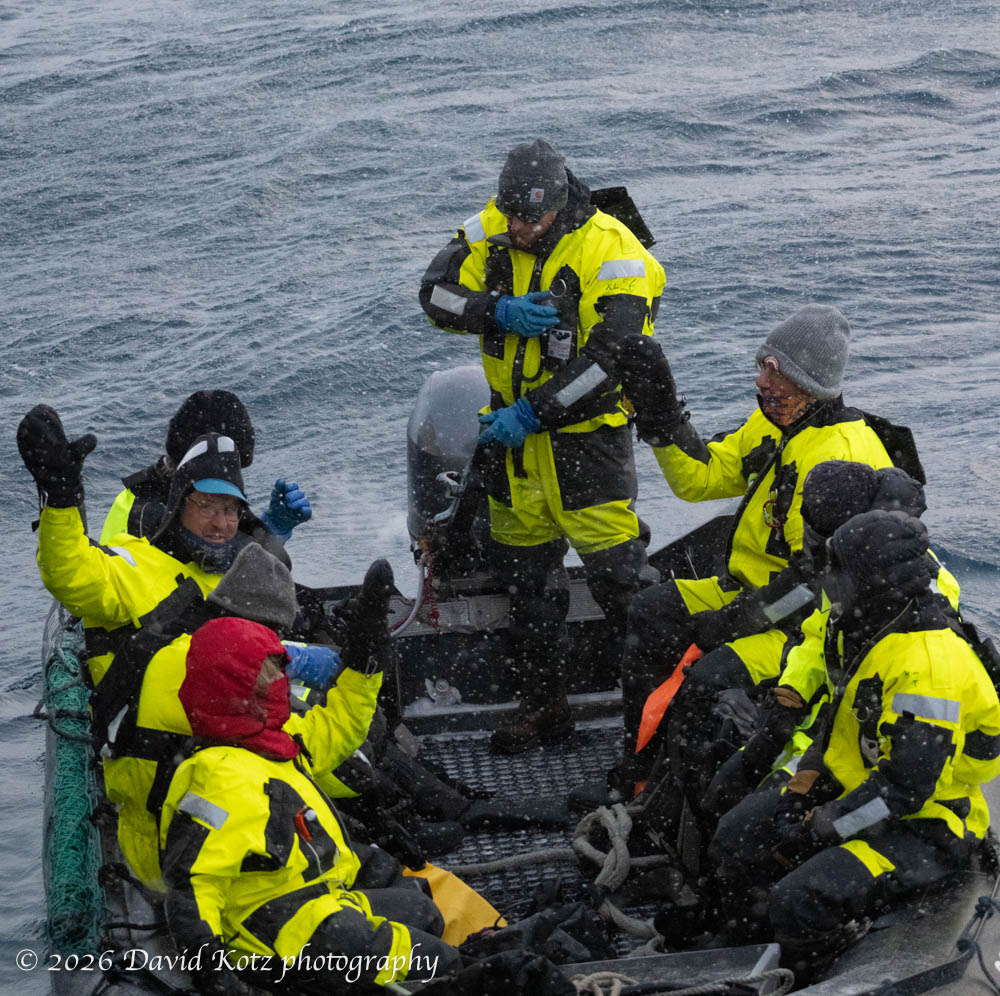 Today was our lucky day. Although a light snow was falling – correction: snow was blowing horizontally in the stiff wind – the ocean was willing. The guides were excited; the conditions were perfect for a landing and for photography. We donned our whole-body safety suits, designed to keep us alive for six hours if we were to fall in the icy water, and climbed into the Zodiac for the short trip to shore.