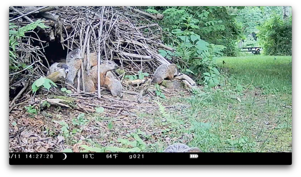 Far in the back of our backyard is a pile of sticks – woody debris we’ve piled up for over 25 years as we trim trees and clear brush. With time, the pile has decomposed and compressed into a thick, firm dome-shaped structure. Last fall I discovered that some critter had burrowed under the pile. This spring I placed one of my wildlife cameras a few feet from the entrance and, in early June, I started capturing video of a big fat groundhog (woodchuck) emerging from the burrow. Then one day, I saw tiny faces appear deep in the burrow. Within a day, seven groundhog pups were exploring the burrow’s “front yard.” Wow, do these little pups have energy! Mama would come and go, presumably to feed (and perhaps to catch a little ‘me’ time), and sometimes to bring back a mouthful of dried leaves to freshen up the interior of their home. Meanwhile, the pups would play, wrestle, climb, and explore. I collected hundreds of minutes of video capturing some fascinating behaviors; here, I edited it down to an eight-minute compendium of my favorite clips. Settle in for eight minutes, and enjoy the video!