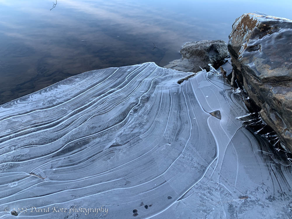 This photo spans only one or two feet across, and the water has receded somewhat… leaving ultra-thin sheet of ice high and dry. Beautiful!