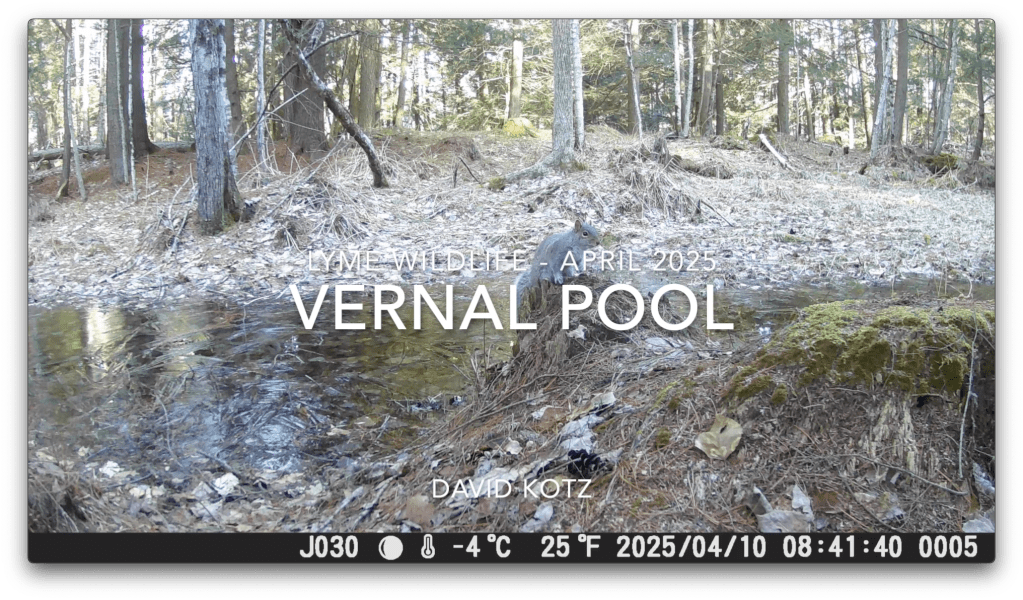 In the Lyme forest, my usual tromping grounds include a couple of vernal pools. These small, shallow depressions fill with water in the spring – initially, from melting snow that cannot yet seep into the still-frozen earth below, and later from early spring rains. They teem with life, and are a particularly important breeding ground for amphibians. They also attract wildlife of all types, to hunt or to drink. I saved aside the clips from my two cameras beside one vernal pool – not included in my April videos shared two weeks ago – because the activity around this pool is so fascinating. It also provides my first ever view of predation in action, in almost two years of work with wildlife cameras.
