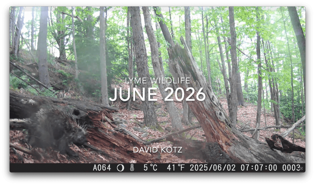 The month of May was surprisingly quiet, as if the animals of Lyme were on the move – not settled in any given location, not often reappearing in the video captures from my wildlife cameras posted in two forests and my own backyard. Some locations that had previously provided multiple daily videos of a busy porcupine couple, for example, became dormant, causing me to explore new locations that may be more lively. One of those turned out to be exceptionally lively, attacked by a bear within days of its deployment! Read on…