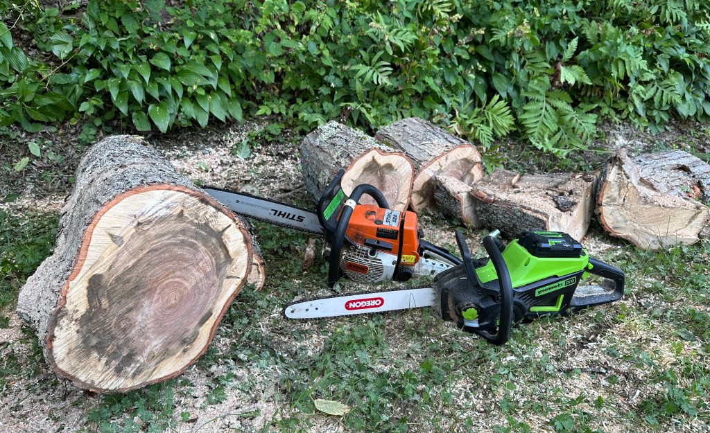 Earlier this year, a large branch snapped off one of our silver maple trees. We sawed, split, and stacked it – firewood for a future winter! Yesterday, I climbed a ladder and sawed off the rest of the branch, which was 10-15′ long. It took an hour or more just to saw it into stove lengths, in part because this branch – just a branch, mind you – was thicker than our chainsaw bar. At one point I decided my Greenworks Pro electric saw (which is awesome, by the way) was just not cutting it. (Sorry, bad pun.) So I pulled out my trusty Stihl 026, our only remaining gas-powered tool. It is more than thirty years old, but still going strong!