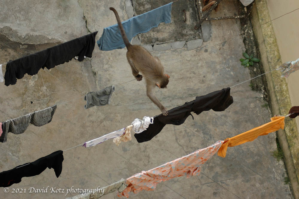 This group, with at least a dozen monkeys, traveled through the trees and landed first on my neighbors’ roof. They strolled across the connecting stairwell, around my laundry, and down into the narrow courtyard that separates us from another neighbor. In that courtyard, they scrambled across the clotheslines (and clothes), explored the windows in hopes of finding one open, and entered a foyer in hopes of finding a door open. In the foyer they found what appeared to be apple peels wrapped in newspaper. These they nibbled as they climbed back up and headed on their way across the next roof.
