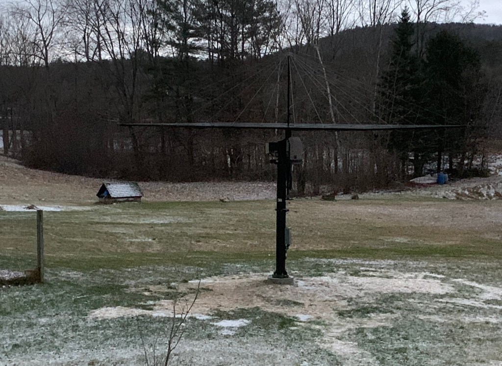 Last night it was extremely windy, with large gusts barreling down the river valley. The forecast was for 2-6″ of snow, but we ended up with only a dusting as the nor’easter storm held mostly to the south. Our solar tracker, however, decided it was better to spend the gusty night horizontally.
