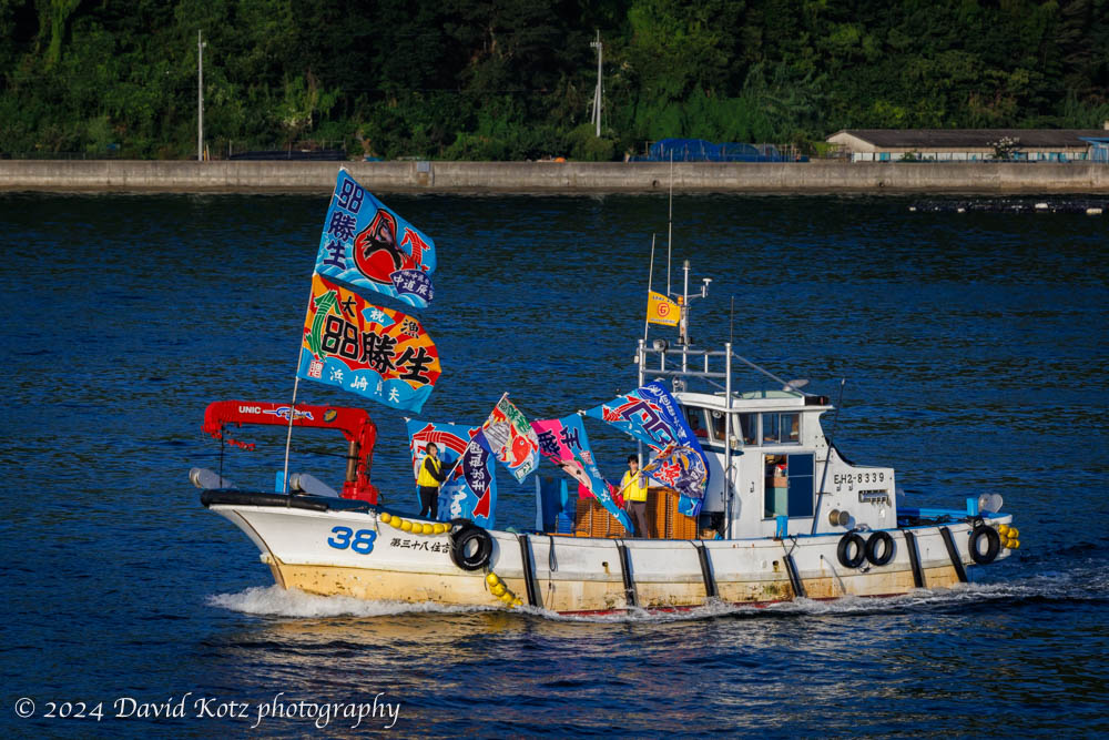 After an overnight transit to Uwajima, along Japan’s inland sea, I was up on deck to watch the sun rise… directly over a mountain peak! As the sun rose and we pulled into Uwajima’s harbor, our ship was escorted by four local fishing vessels that had been elaborately decorated with banners and flags. On each boat there were one or two enthusiastic volunteers who were waving massive flags, all meant to welcome us to their city. [video]. Read on!
